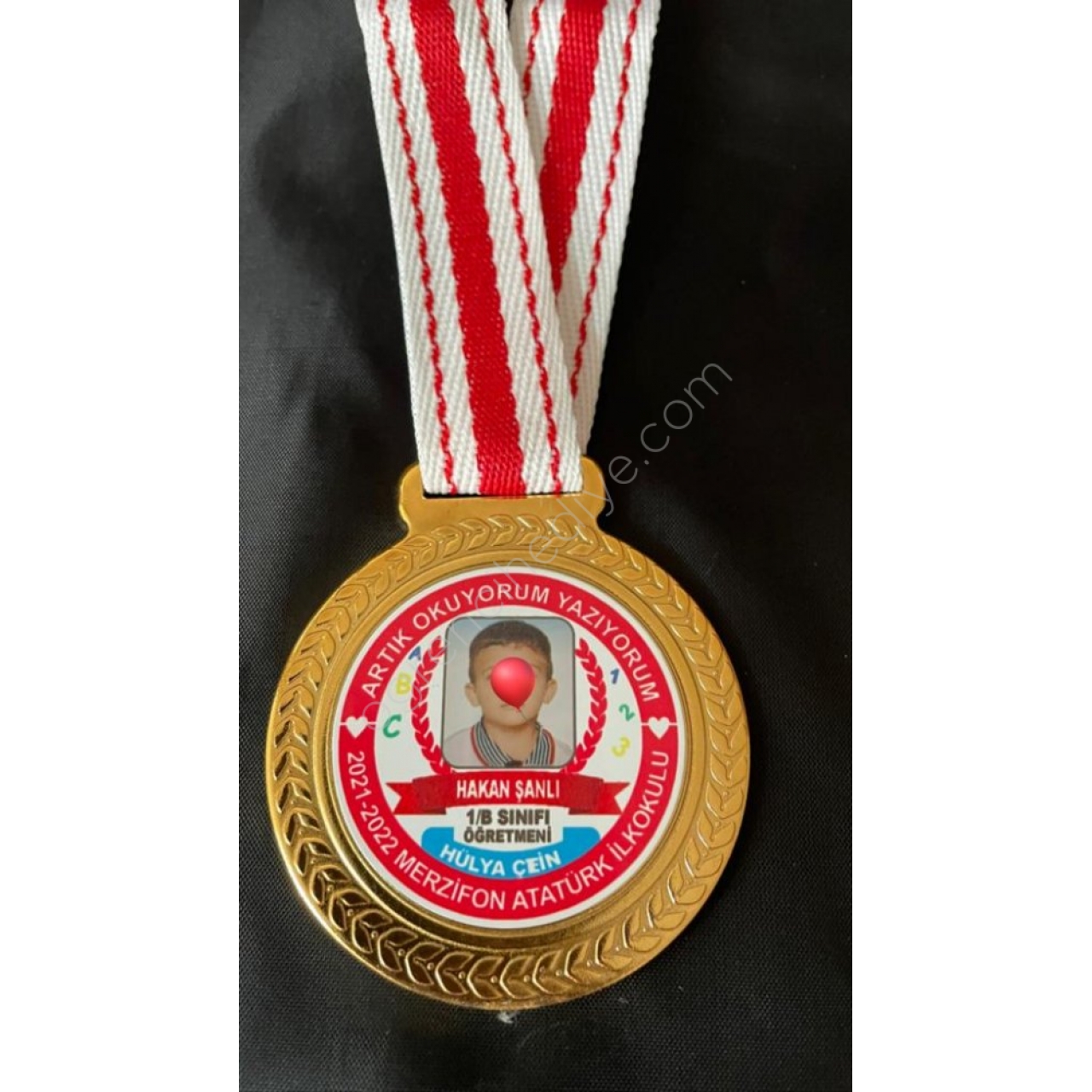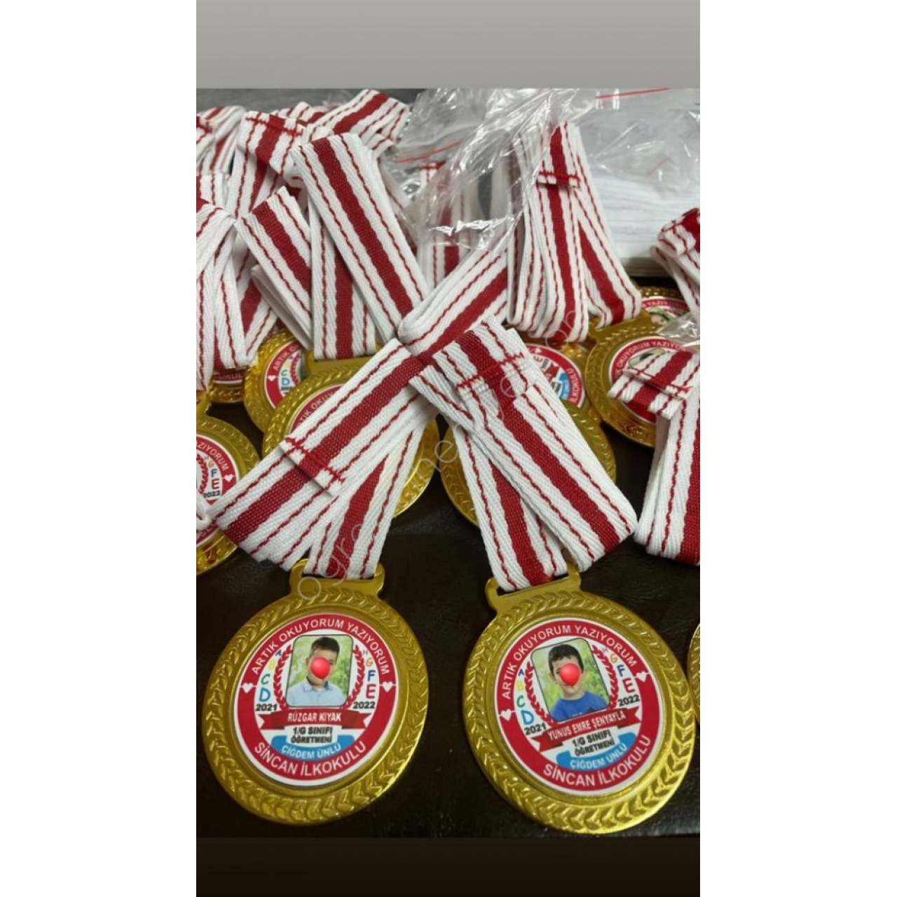 Madalyada Okul adı, Öğretmen adı, Öğrenci adı ve resmi, ve sınıf bilgisi bulunan renkli özel tasarımlı modeldir..