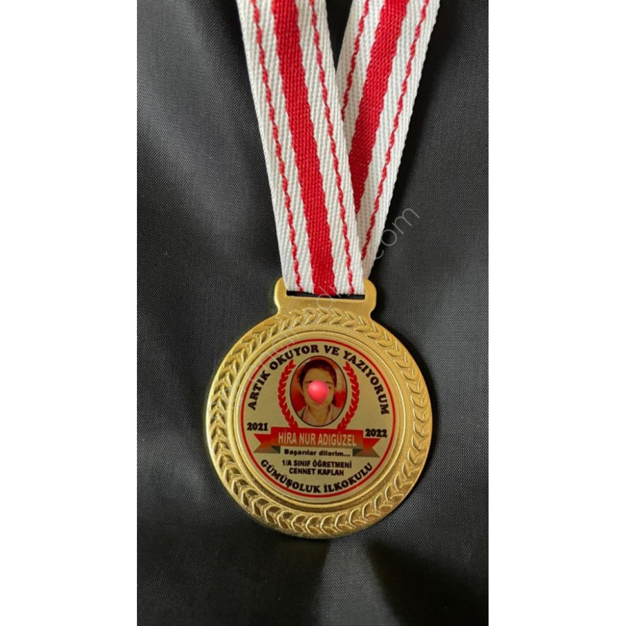 Madalyada Okul adı, Öğretmen adı, Öğrenci adı ve resmi, ve sınıf bilgisi bulunan renkli özel tasarımlı modeldir..