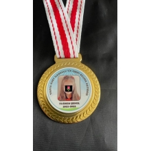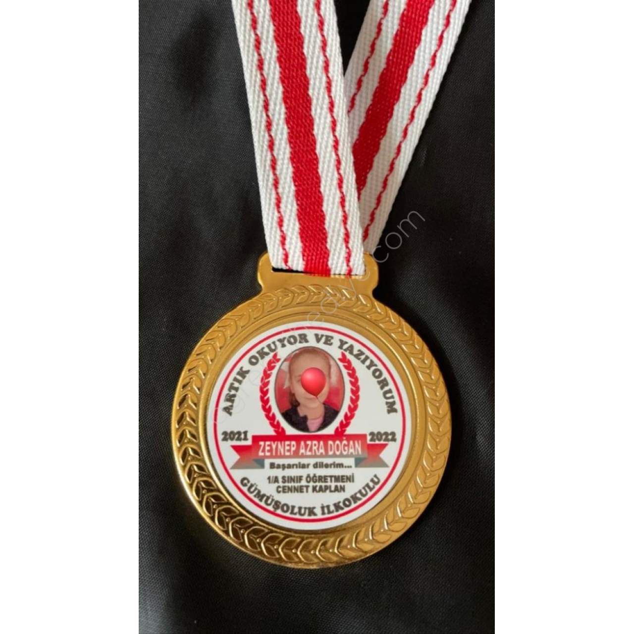 Madalyada Okul adı, Öğretmen adı, Öğrenci adı ve resmi, ve sınıf bilgisi bulunan renkli özel tasarımlı modeldir..